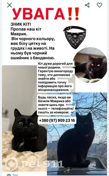 Пропав доглянутий стерилізований кіт Маврик у місті Бібрка біля траси Н-99 З чорним ошийником у формі бандани Вік 5 років Спокійний, чемний, вагою 5 кілограм Особливі прикмети: внаслідок пошкодження хребта трохи закидує лапки при бігу, у кутку правого ока шрам, досі маємо надію, що наш котичок знайдеться, будемо вдячні за будь яку допомогу!!