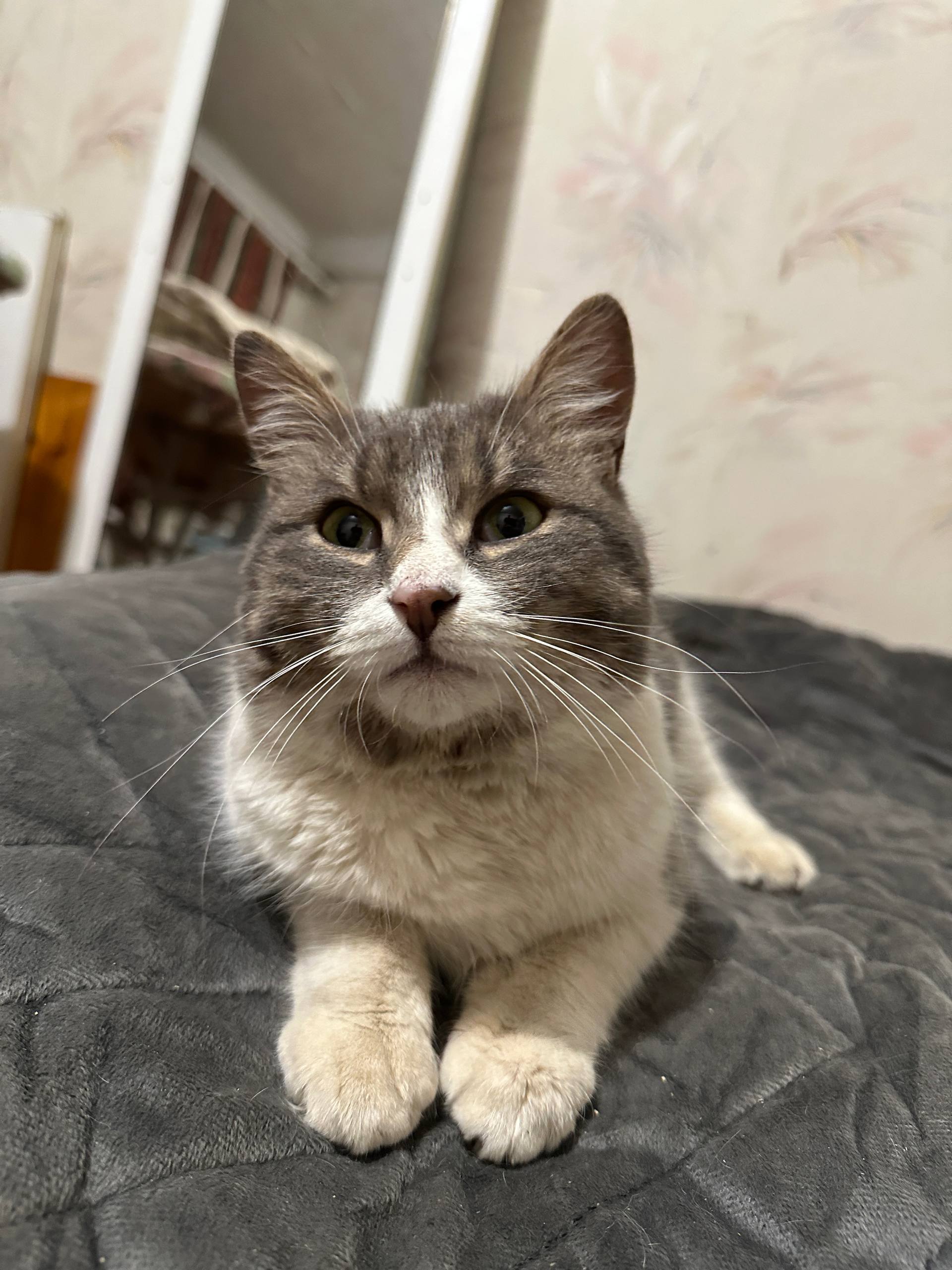 Сіро білий кіт(хлопчик), ласкавий, йде до рук...