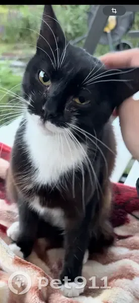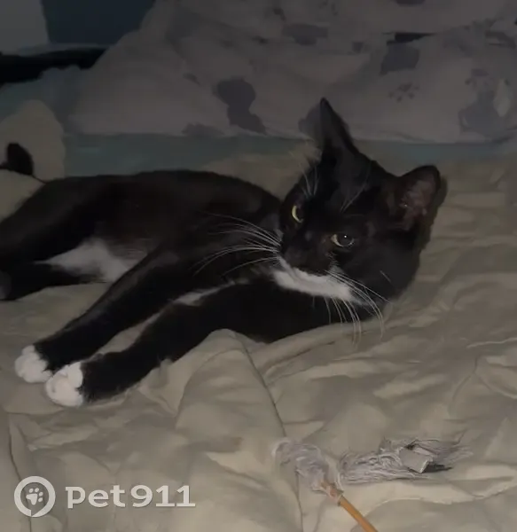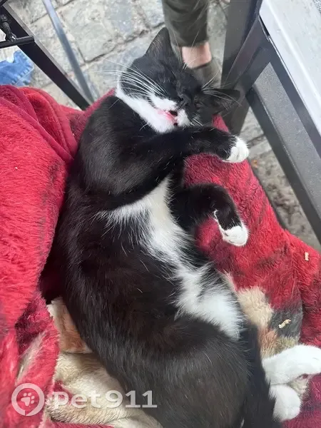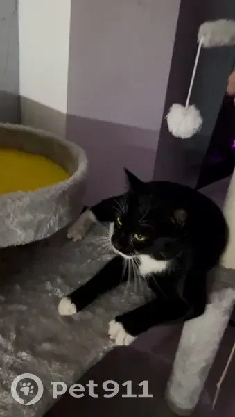 Черно-белый, длинные Усы, рана но хвосте возле основания, пугливый, 1.5 года, среднего размера, но вытянутый, 3-4 кг, людей боится, может быть с другими котами,