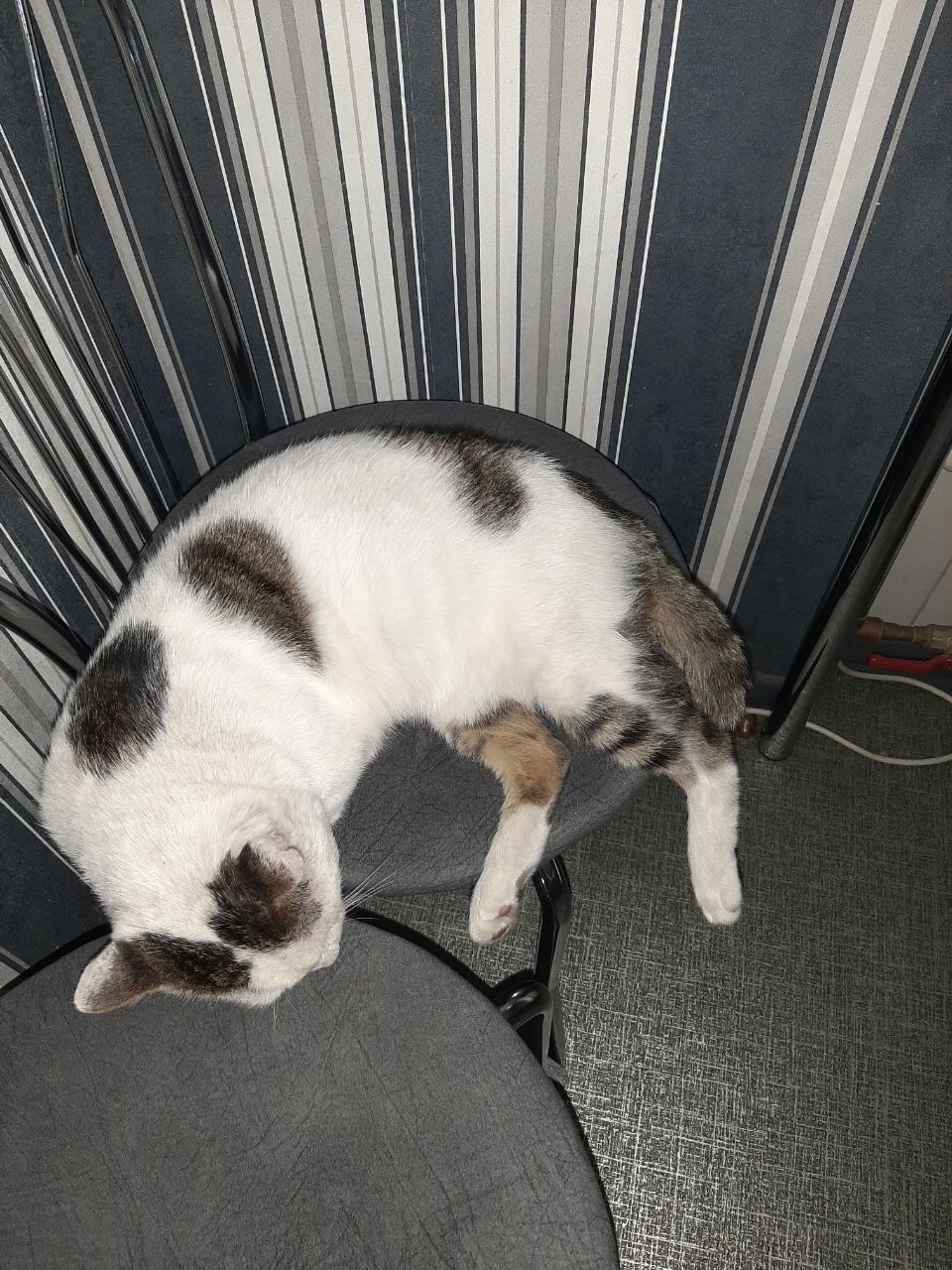 Білий кіт з сіро коричневими пятнами. На голівці пятна в виді окулярів, живіт білий повністю. Носик поцарапаний, ушко пошкоджене ,через бійку з котами. Домашній, перебирає в їжі. Відгукується на Мурчик