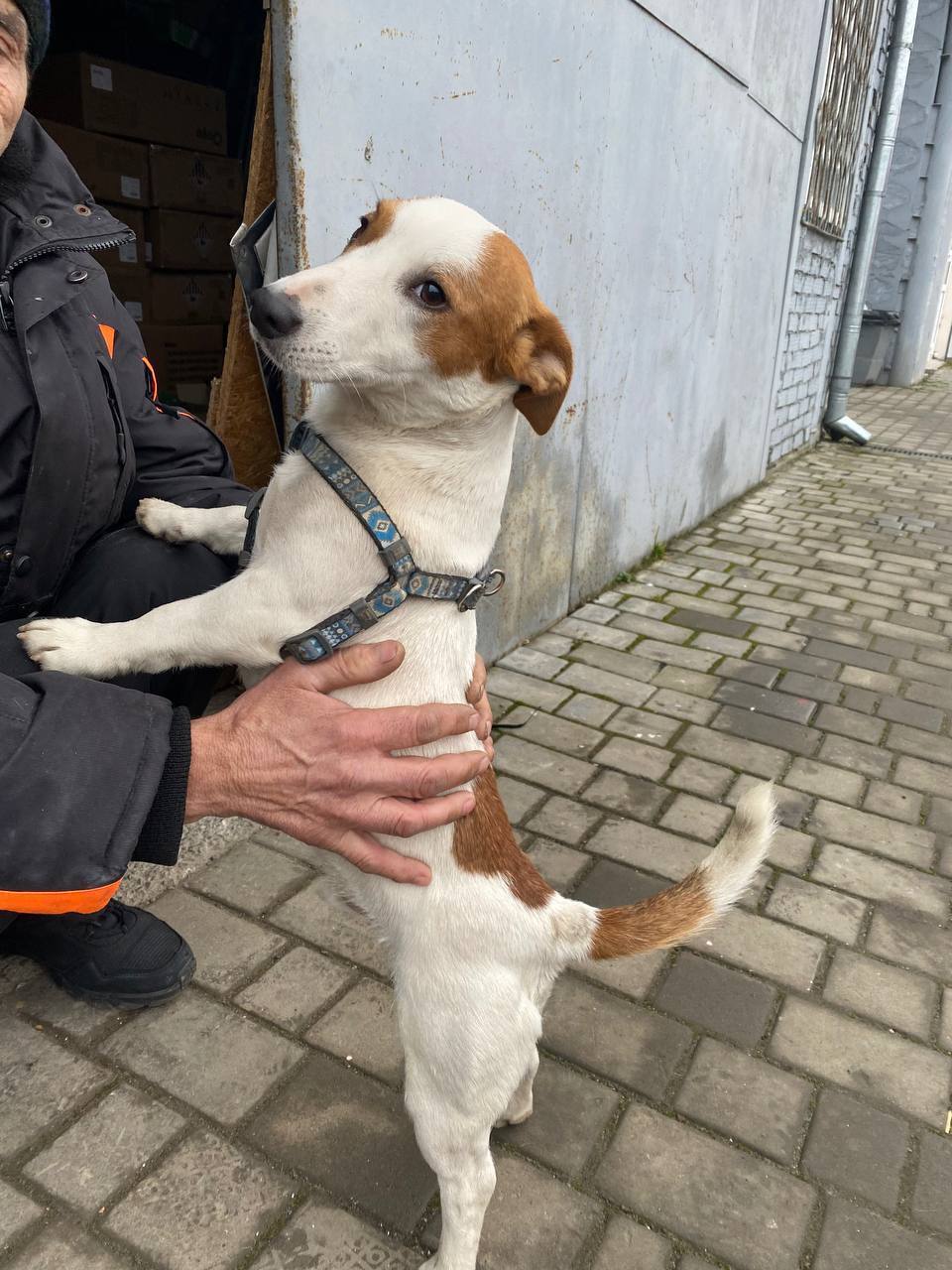 Невеликий собака, схожий на джек-рассел-тер’єра. Забарвлення: біле з рудо-коричневими плямами. Руда пляма на голові, одне вухо руде, друге світле. На спині та біля основи хвоста є руді плями. Хвіст середньої довжини, біло-рудий. Шерсть коротка, гладка. Статура компактна, лапи короткі. На собаці блакитна шлейка з візерунком, є круглий жетон на кільці. Собака доглянута, контактна, ймовірно домашня. Знайдено собачку! Місто Хмельницький. На речовому ринку. 2 день шукаємо власника. На стресі не хоче їсти На qr є тільки пошта, туди писали, відповіді немає.