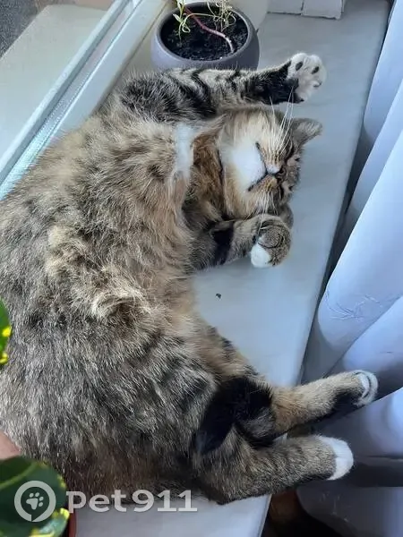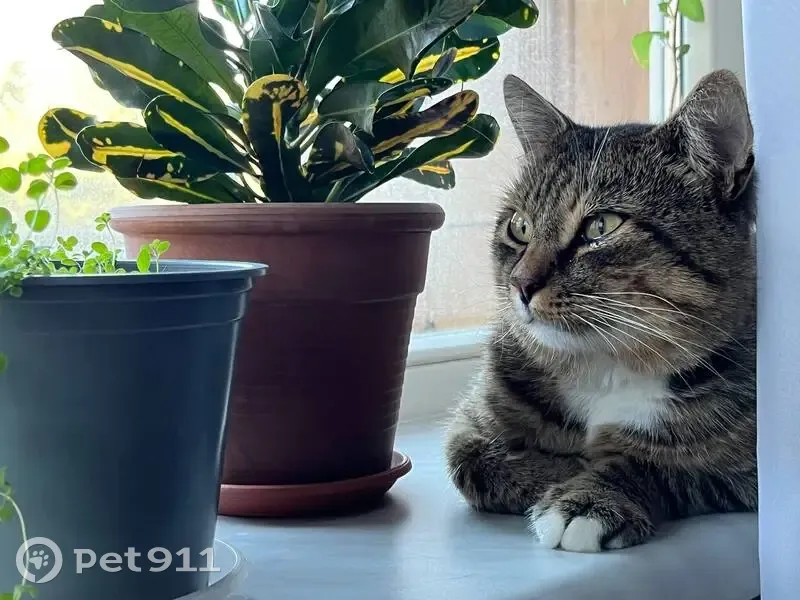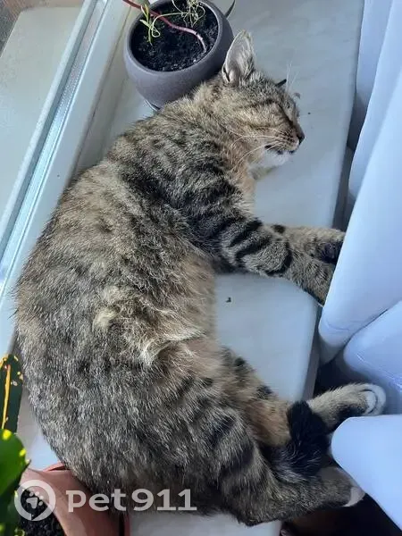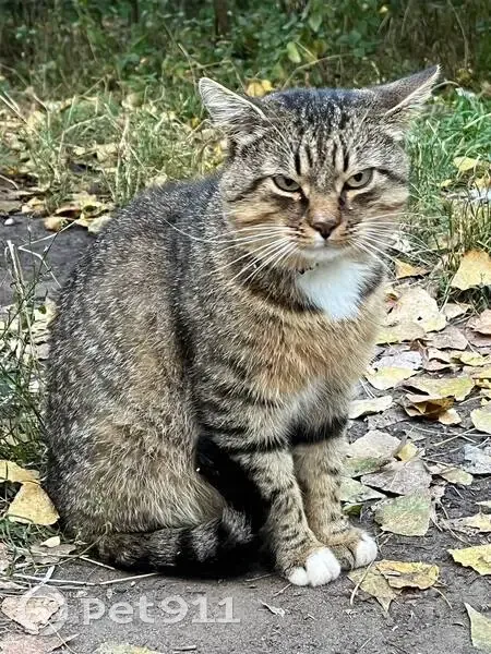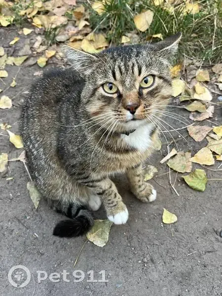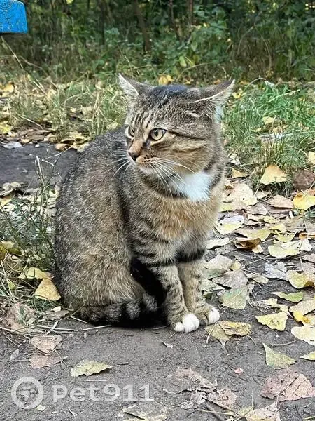 Окрас: тигровий (таббі, шпрот); особливості: короткошерстий, безпородний, білі лапки та грудка, був з антиблошиним нашийником; знайшли: на майданчику з турніками, в Бабиному Яру, сидів там зранку до вечора (перехожі казали що раніше бачили його в тому ж місці приблизно місяць назад); поведінка: поводить себе чемно, до людей ластиться, трохи шарахається гучних звуків і рухів, постійно гучно муркотить.