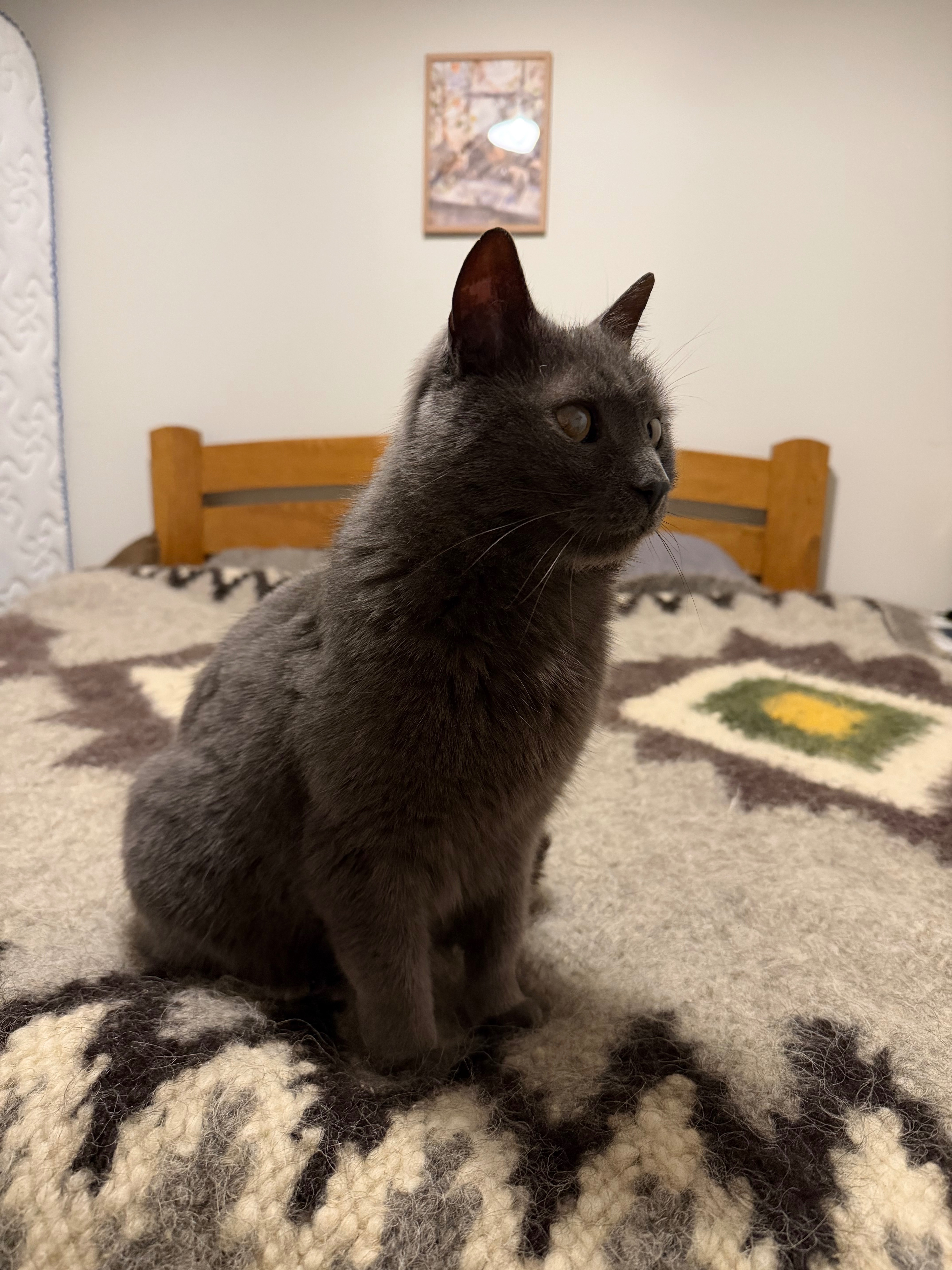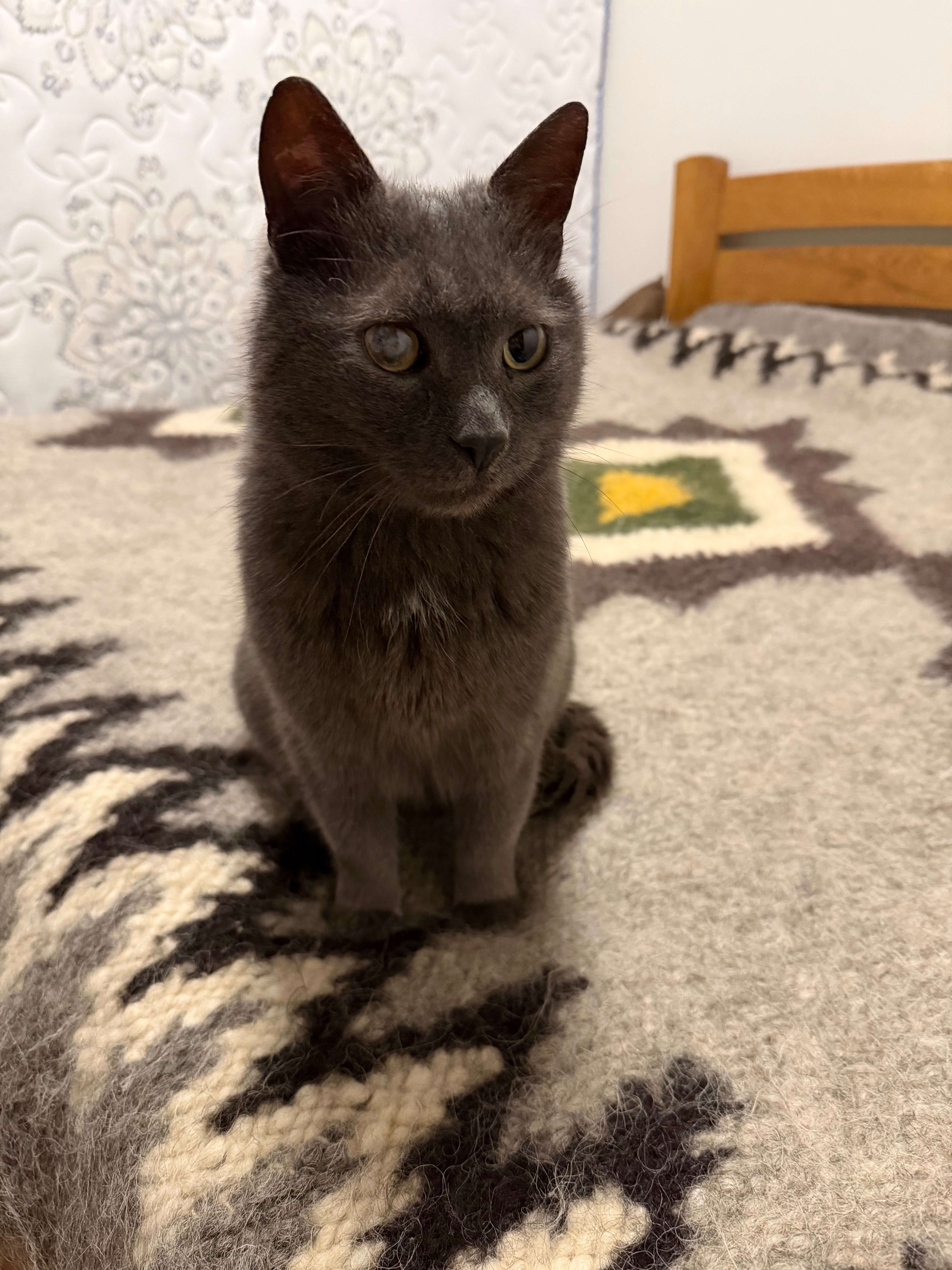 Сірий котик, товстенький, на правому оці щось схоже на катаракту, на грудці маленька біла плямка. Він був наляканий і дезорієнтований на вулиці, мявкав, бігав по проїзжій частині біля Platform 9 3/4 і Drinkery