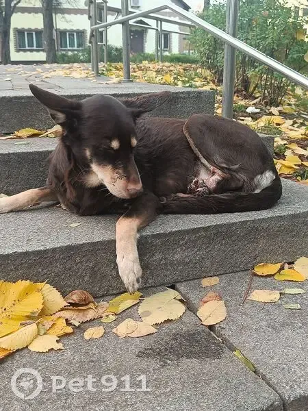 Шоколадний окрас, собака сиділа в парку на стежці травмована, однієї задньої лапи в неї вже немає.. Дуже гарно виглядає не схожа на дворову, можливо хтось загубив.