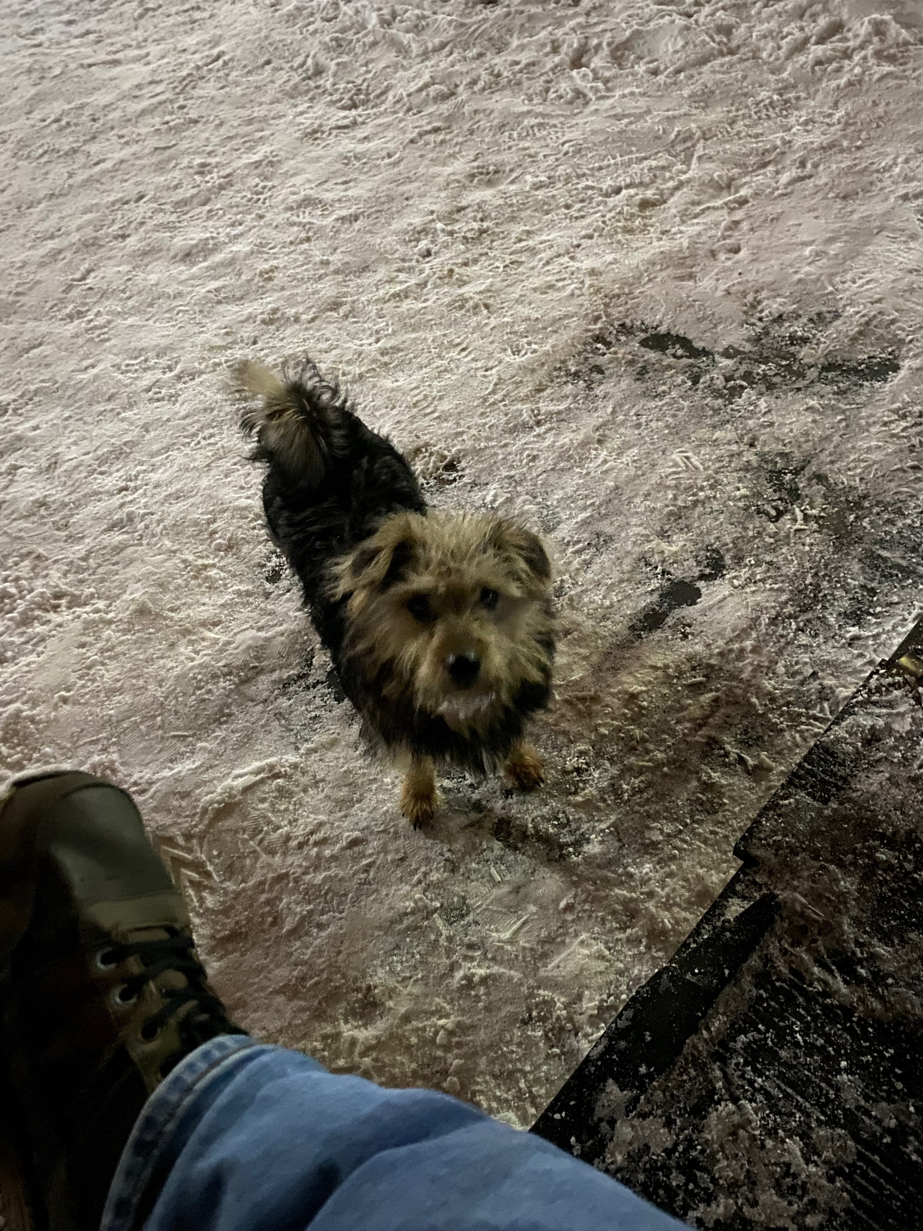 Порода наче метіс, дуже дружелюбний, молодий, на ньому ошийник який кріпиться на ногах. Зустрівся з ним біля дитячого майданчику за магазином СПАР за метро Славутич і він за мною побіг, водив його години 2 по цій площі але ніхто його не шукав і він пішов зі мною додому. З деталей в нього ідеальні білі зуби , наче все сказав