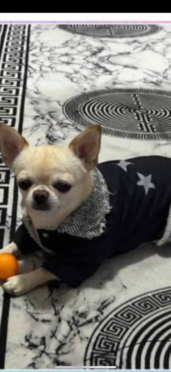 Кремовий Чіхуахуа, у синій шубці з зірочками...