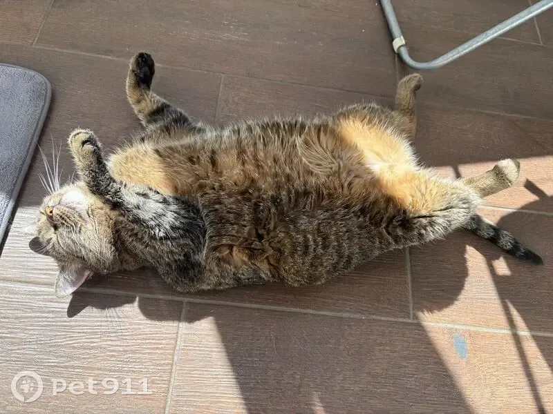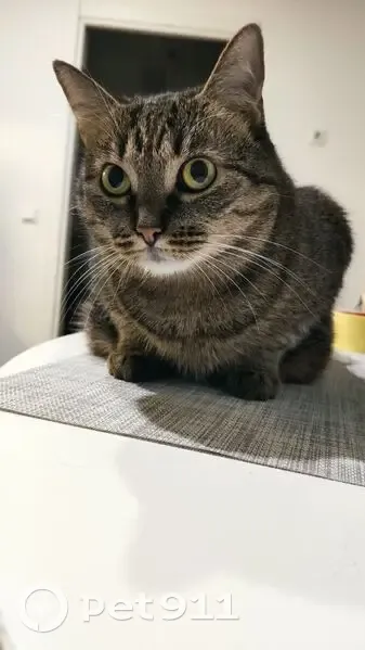 Особливі прикмети: коричневий з чорним полосатік, світлий животик, невеличка шишка на голові, типу жировик. Киця невелика але вгодована. Вона 5 років прожила в квартирі. Дуже ляклива. Боїться чужих людей, собак, вітру, дощу, грози.