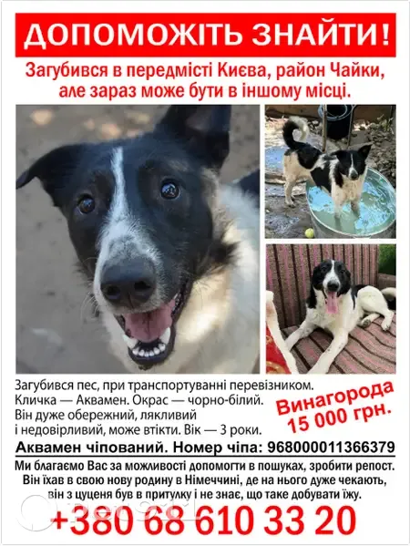 Аквамен — молодий песик, який із цуценяти виріс у притулку для безпритульних тварин. Його загубив перевізник під час транспортування з Харкова до його нової родини в Німеччині. Зник у передмісті Києва, на трасі навпроти району Чайки. Але зараз, звісно, він може бути будь-де! Будь ласка, Аквамен був за крок до щасливого домашнього життя. Його дуже чекають удома. Його господар пропонує винагороду у 15 тисяч гривень тому, хто його знайде або надасть інформацію про його місцезнаходження, яка допоможе нам його відшукати. Ми гарантуємо оплату! Будь ласка, дуже вас просимо — допоможіть повернути Аквамена