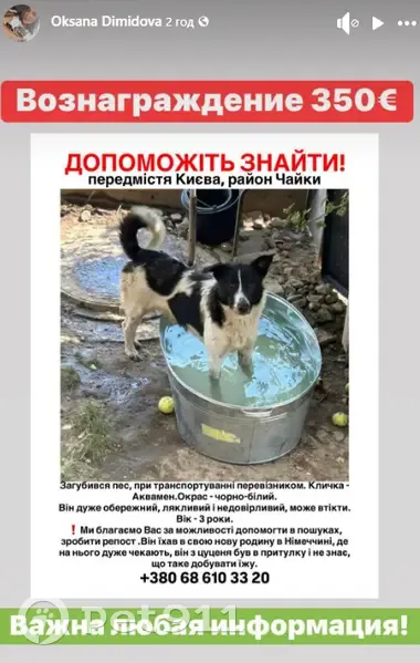 Аквамен — молодий песик, який із цуценяти виріс у притулку для безпритульних тварин. Його загубив перевізник під час транспортування з Харкова до його нової родини в Німеччині. Зник 23.10.2025 у передмісті Києва, на трасі навпроти району Чайки. Але зараз, звісно, він може бути будь-де! Будь ласка, Аквамен був за крок до щасливого домашнього життя. Його дуже чекають удома. Його господар пропонує винагороду у 15 тисяч гривень тому, хто його знайде або надасть інформацію про його місцезнаходження, яка допоможе нам його відшукати. Ми гарантуємо оплату!