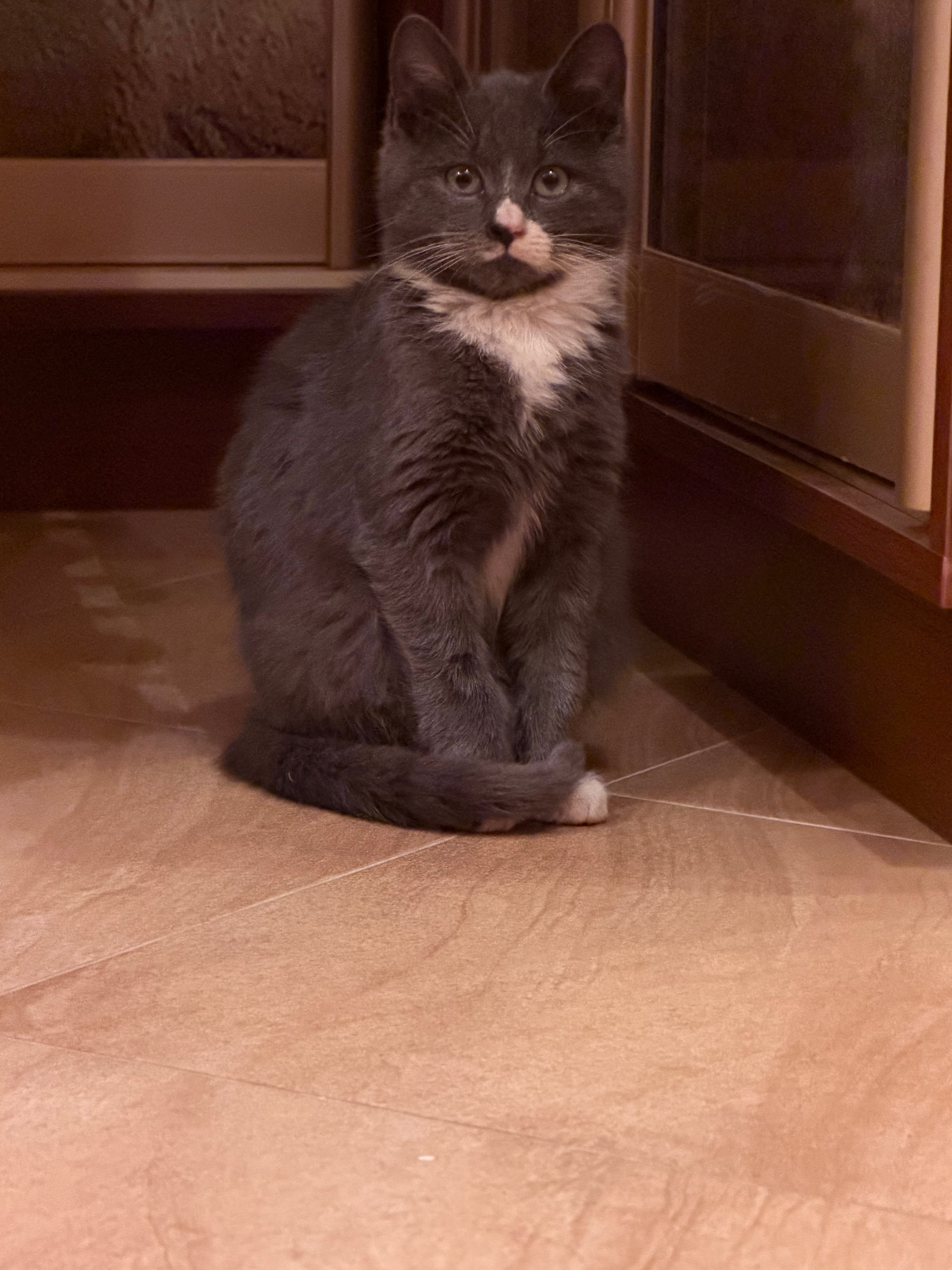 Котик, приблизно 3-4 місяці, сіренький з біли...