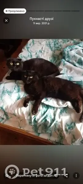 Чисто чорний висловухий кіт Черниш, мав синій ошийник резиновий від блих. Мініатюрний, вік 4 роки. Пропав 1,5 роки тому після мого від'їзду з села в місто. Вийшов як завжди в сад гуляти по знайомому маршруту і не повернувся. Пошуки і опитування сусідів результатів не дали. Але я не втрачаю надії,бо його слідів знайдено не було
