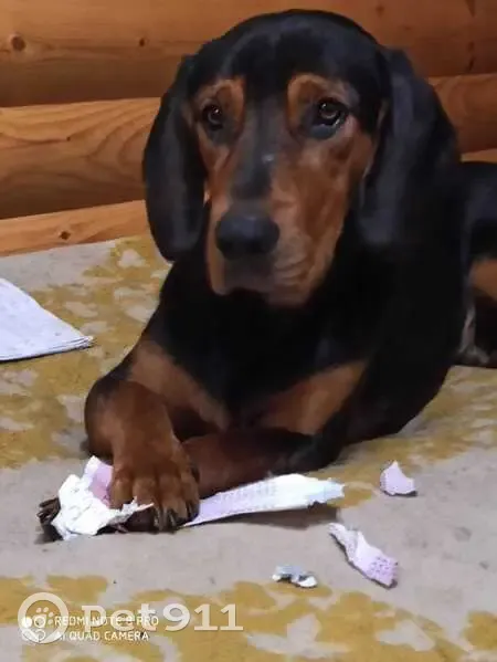 Український карпатський гончак . Вік 6 років. Чорний з різко виділеними рудими підпалинами на морді, надбрівних дугах, грудях, внутрішній і зовнішній стороні кінцівок, Кобель.