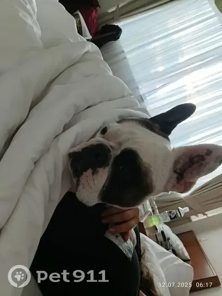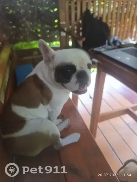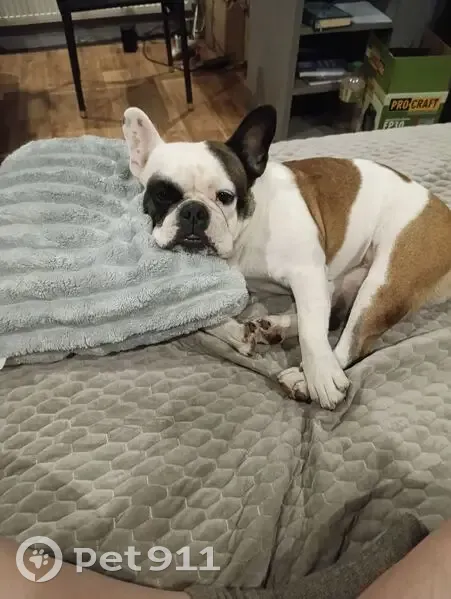Французский бульдог, дівчинка , 6років клічка Мікі. Купований хвіст, окрас білий з рудими і темнокорочнивим плямами, на животі майже непомітний шрам від операції, на нижній щелепі стирчить маленький зубчик. Блідно оранжевий ошейник.