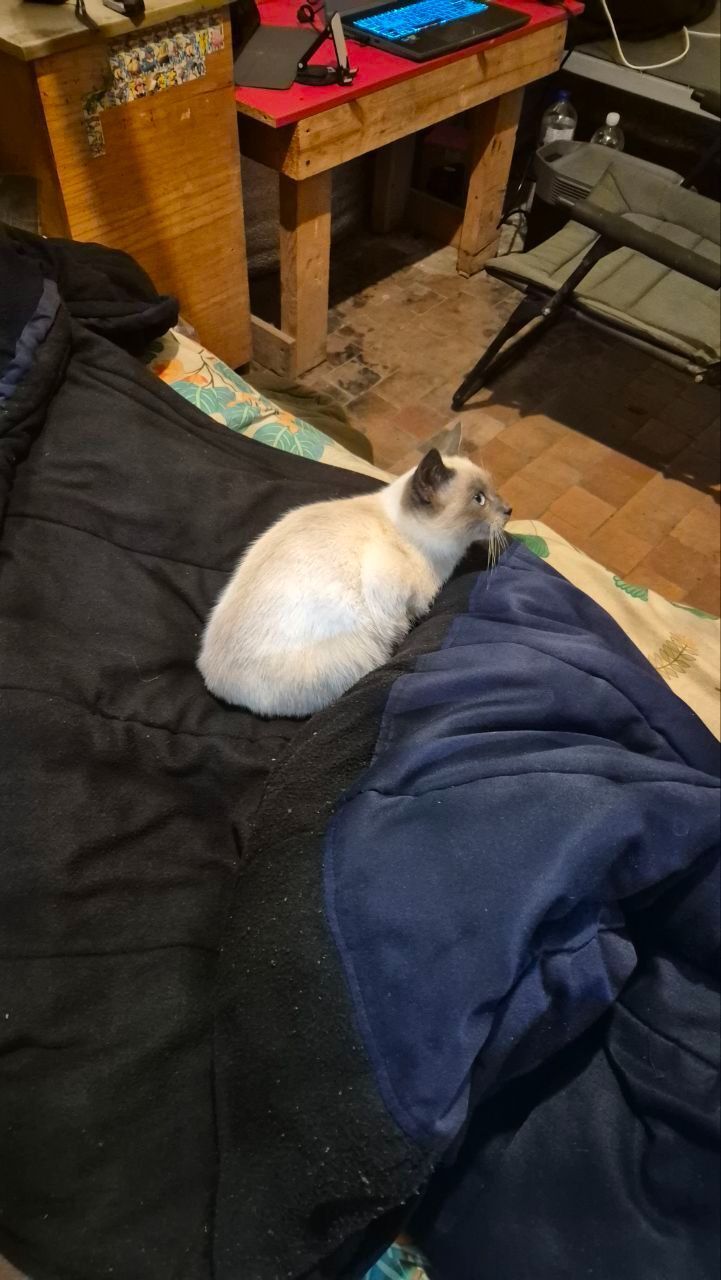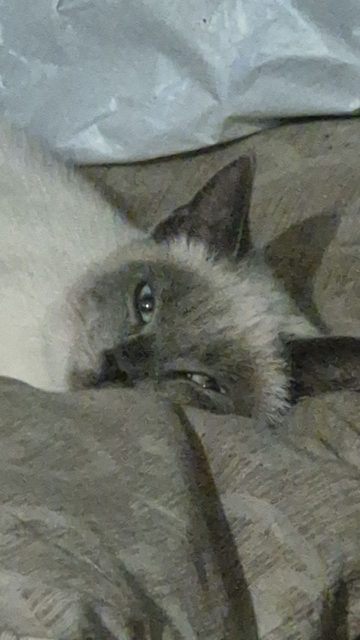 Вуха, лапи, хвіст і трішки мордочка чорні, а сам він білий, але може зараз брудний. Оченята блакитні. Втік з машини, коли їхав з позиції в свій новий дім. На жаль, нашийника на ньому не було. Побіг в сторону села Карпилівка.