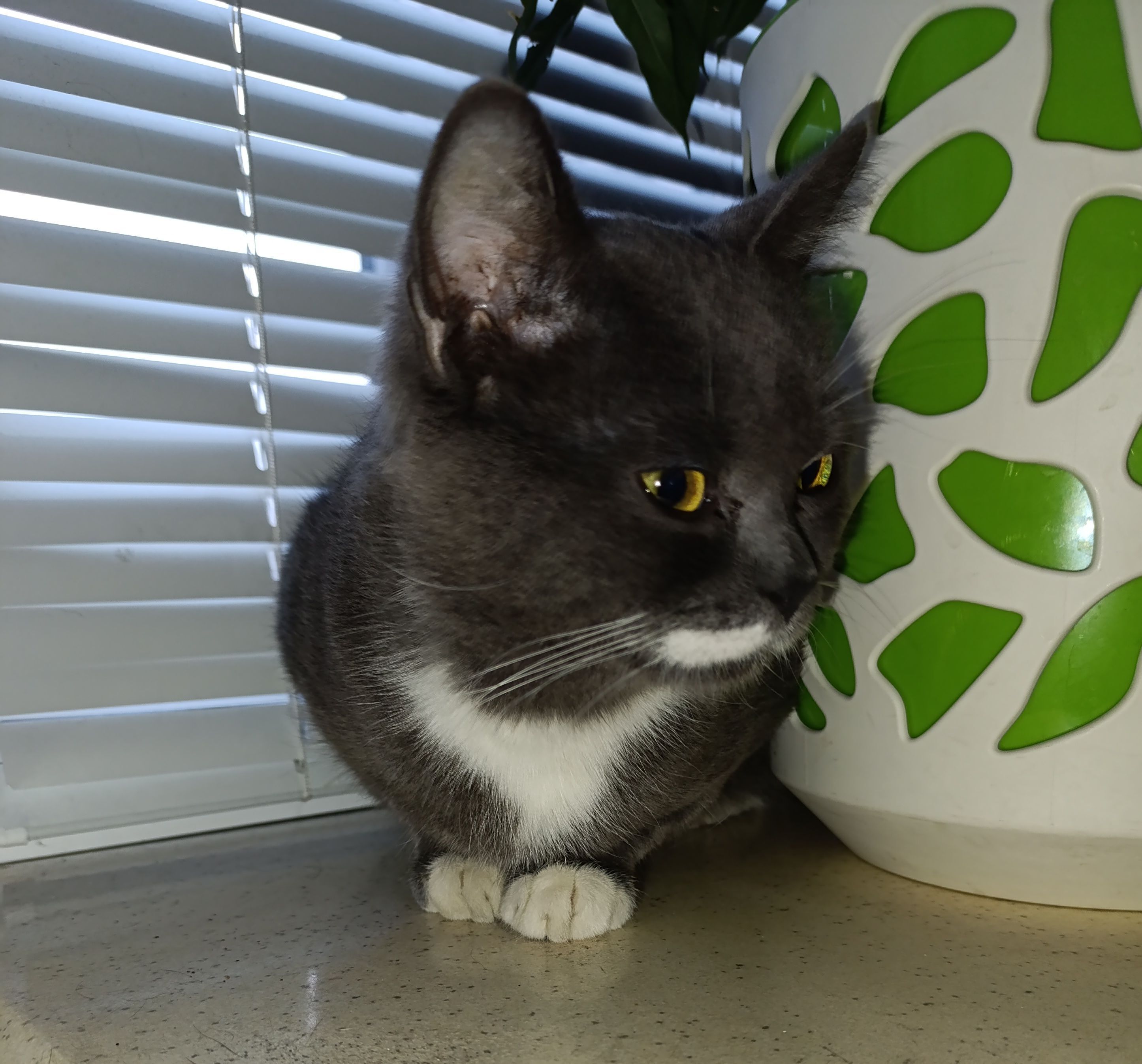 Хлопчик, схожий на британця, сірого попелястого окрасу, має білі лапи, та білі плями на животі і мордочці, жовті очі. Спокійний. Дитина знайшла в під'їзді наляканого. Кіт на вигляд молодий, не кастрований.