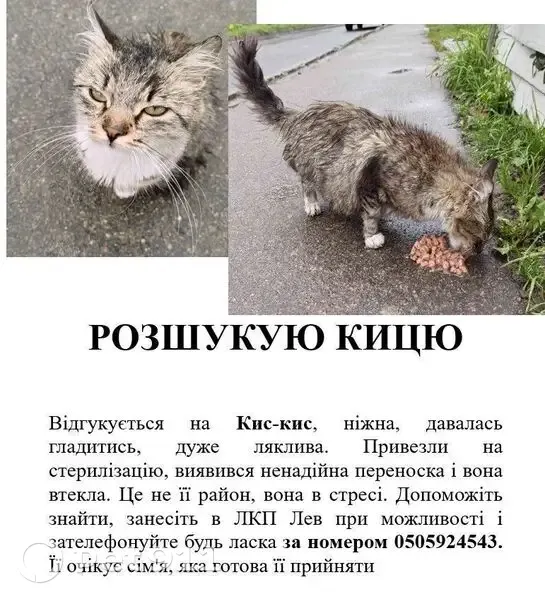 Відгукується на Кис-кис, ніжна, давалась гладитись, дуже ляклива. Привезли на стерилізацію, виявився ненадійна переноска і вона втекла. Це не її район, вона в стресі. Допоможіть знайти, занесіть в ЛКП Лев при можливості і зателефонуйте будь ласка за номером 0505924543. Її очікує сім'я, яка готова її прийняти