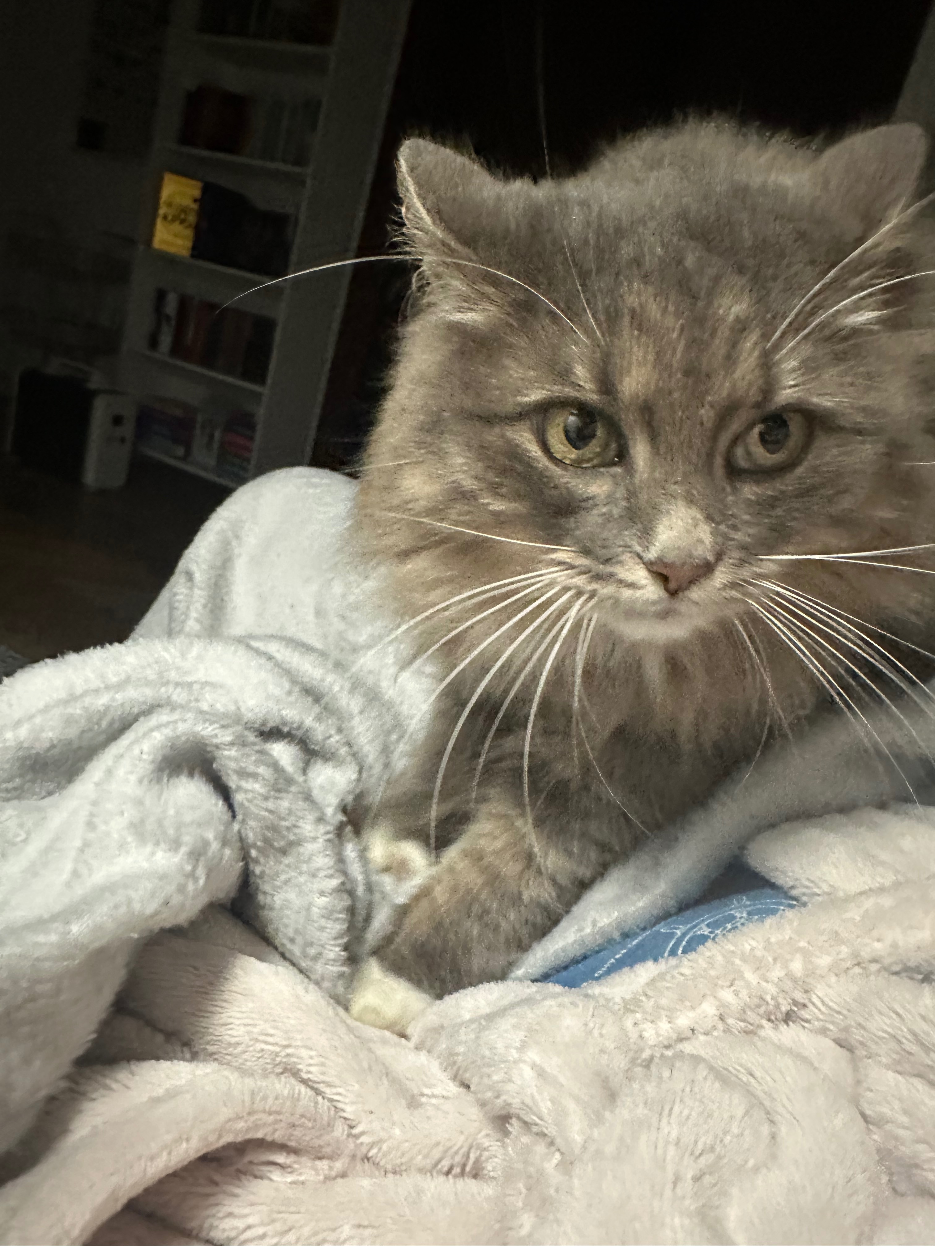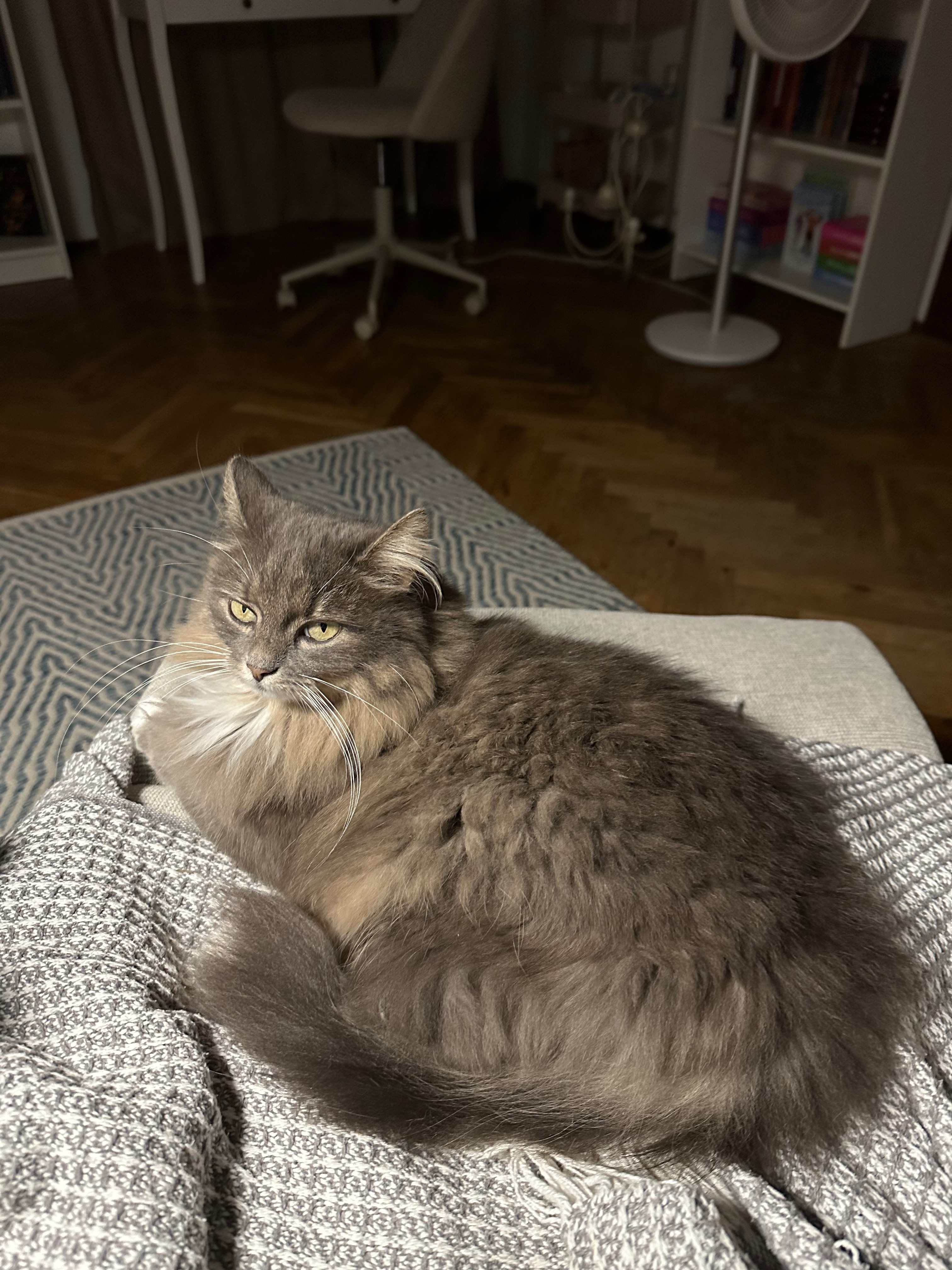 Сіра довгошерстна пухнаста кішка, має білі лапки і грудку. Боязка, але достатньо ласкава. Вона вийшла прогулятися з приватного будинку і не повернулась 30 грудня близько 22:30-23:00