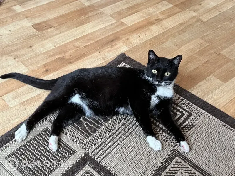 Чорно-біла кішечка. Є невеликі залисини на вилицях. Зверху одного ока білі вусики, а на іншому чорні(ледь помітні). Має чотири білих носочка на лапах, білий комірець та вуса. Скоріше за все випала з вікна другого поверху. Не любить, коли їі торкаються за задні лапи і хвіст, бо колись був перелом.