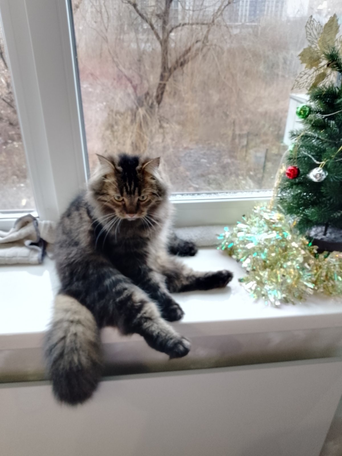 Тоша — чорно-коричнева таббі, 4 роки дуже пухнастий, зелені очі.