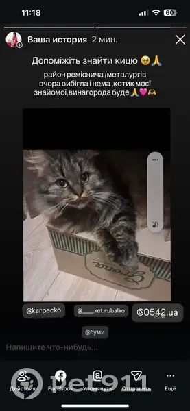 Трьохмасна(риженьке, коричньове ,біле), пухнаста, дуже пухнасний хвіст, схожий на веєр, на шийкі буа білий ошийник, стерилізовага) .Кішка Муся домашня.Пішла на вулицю і не повернулася. Люди добрі, БЛАГАЮ ВАС, ДОПОМОЖІТЬ ЗНАЙТИ!!!!!!!!! ВИГАГОРОДА 20 ТИСЯЧ ГРИВЕНЬ.ОБІЦЯЮ!!!!!!!!МІЙ НОМЕР ТЕЛЕФОНУ 0682541062 ІРА.