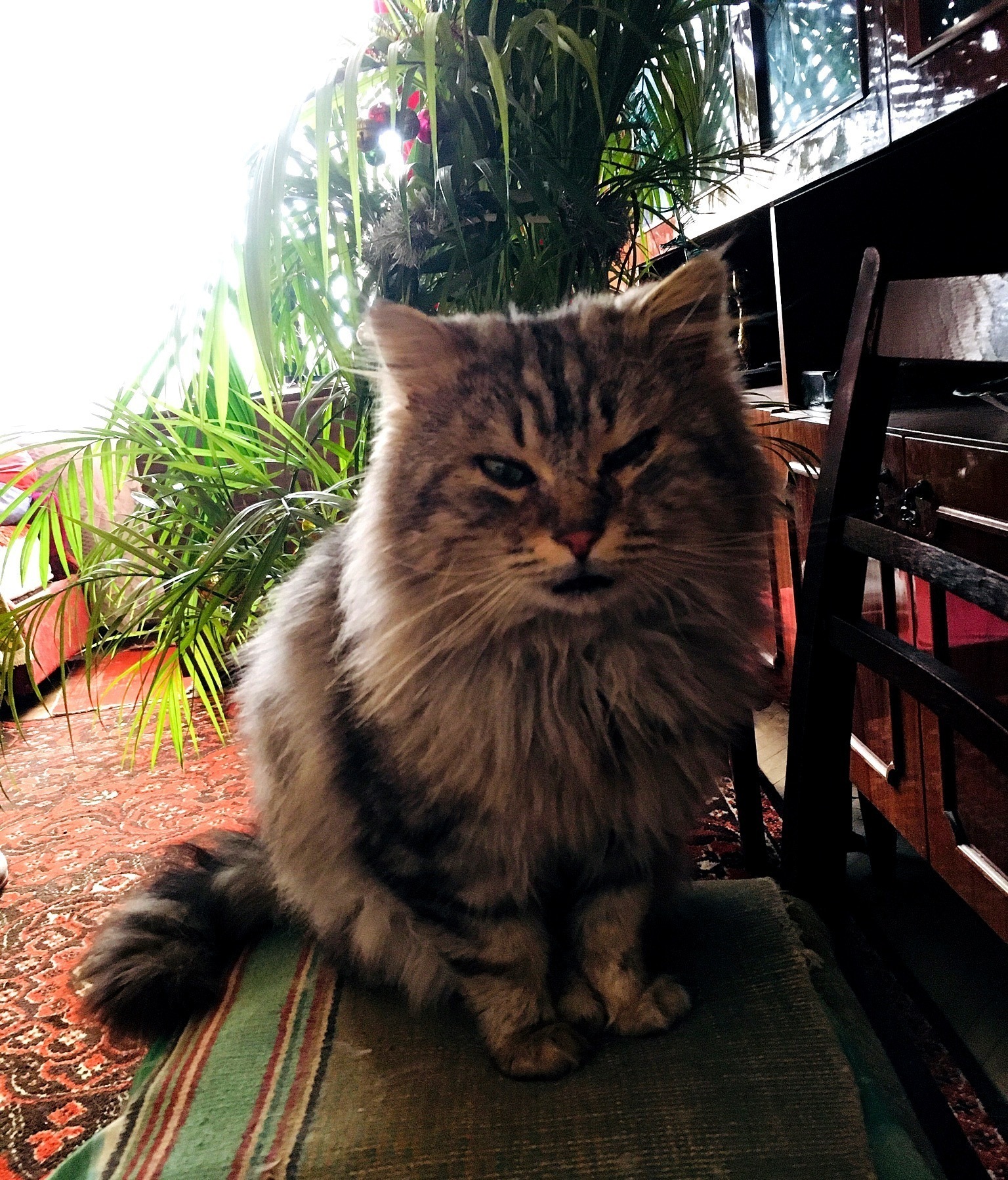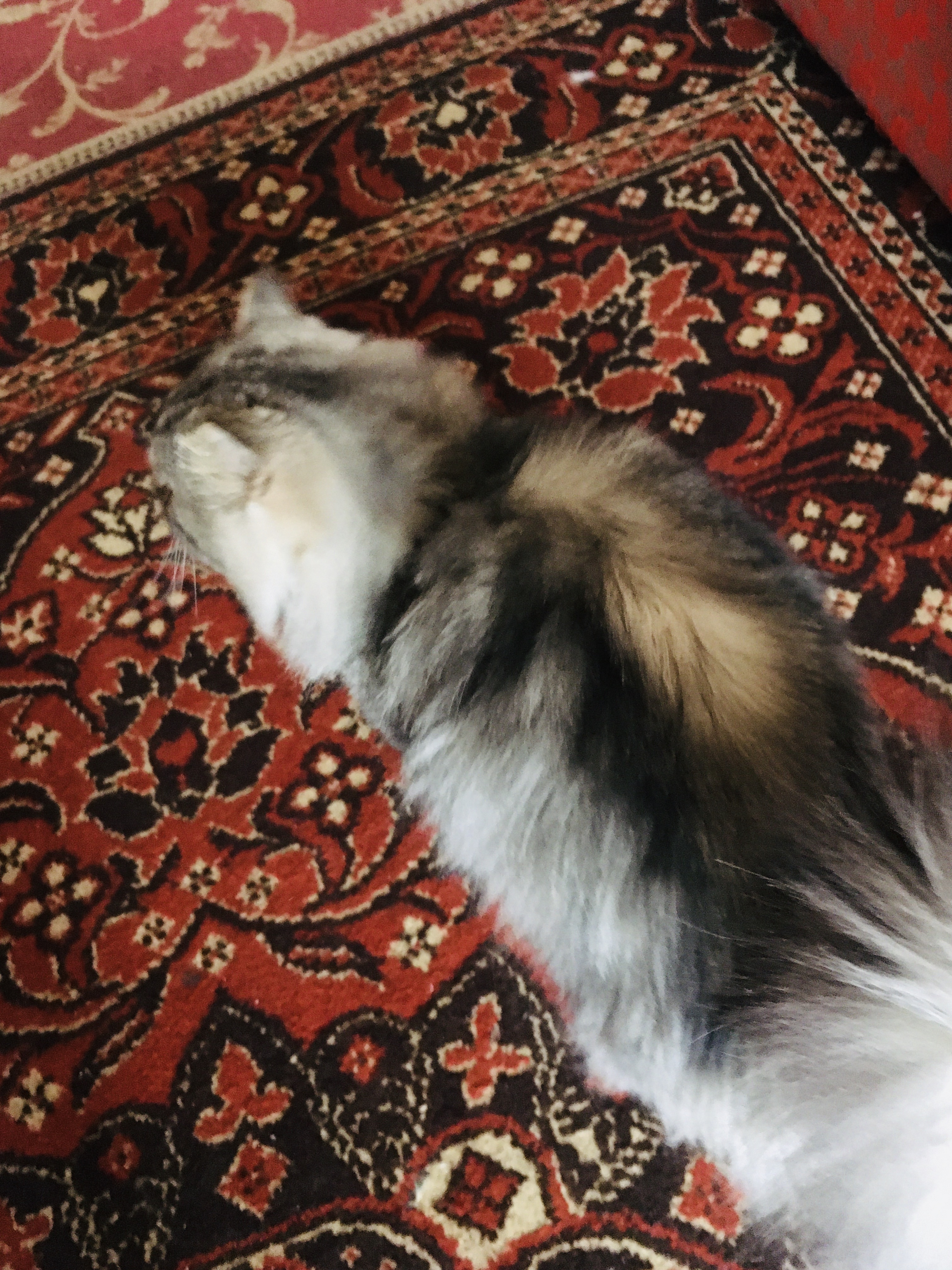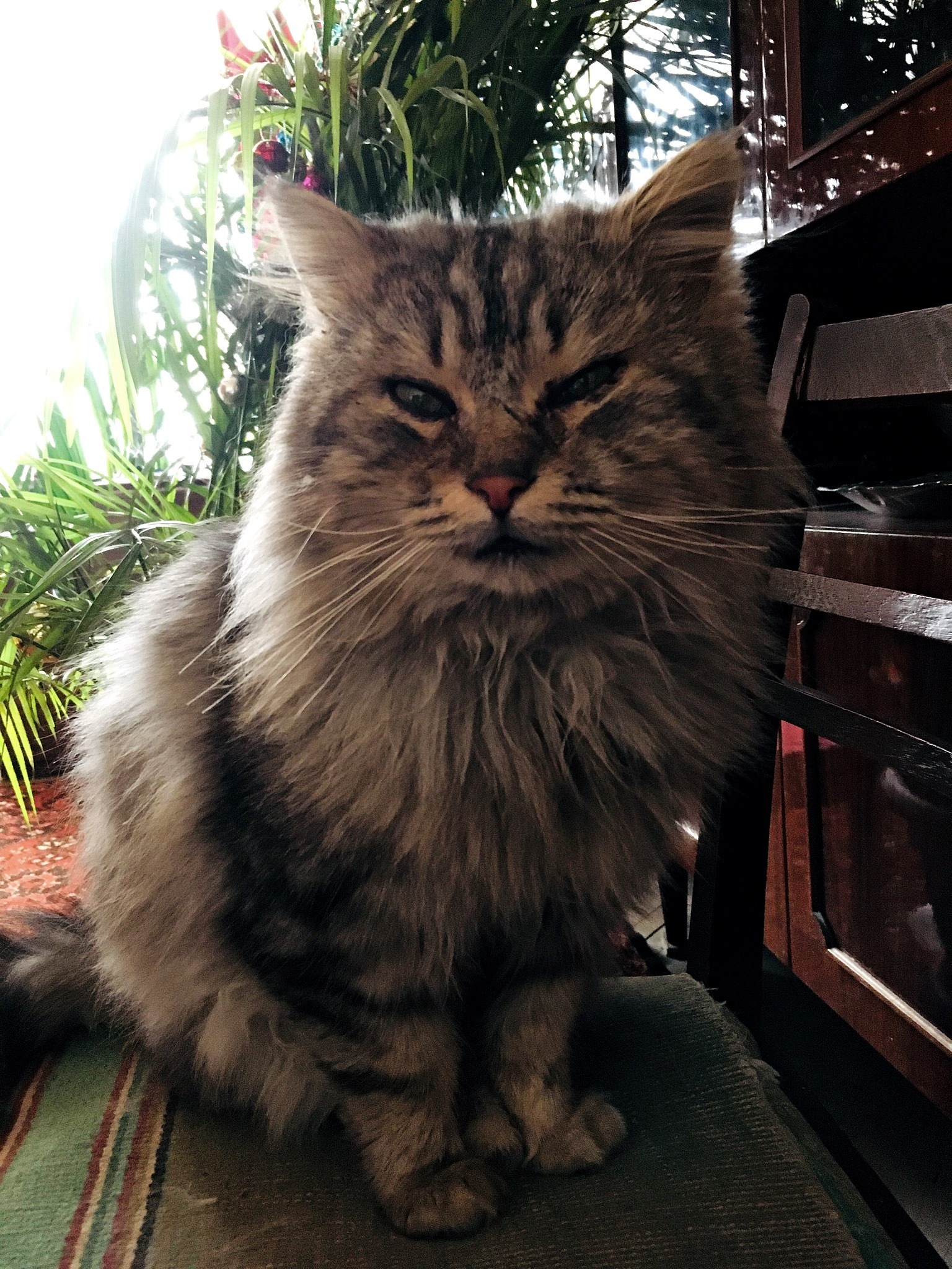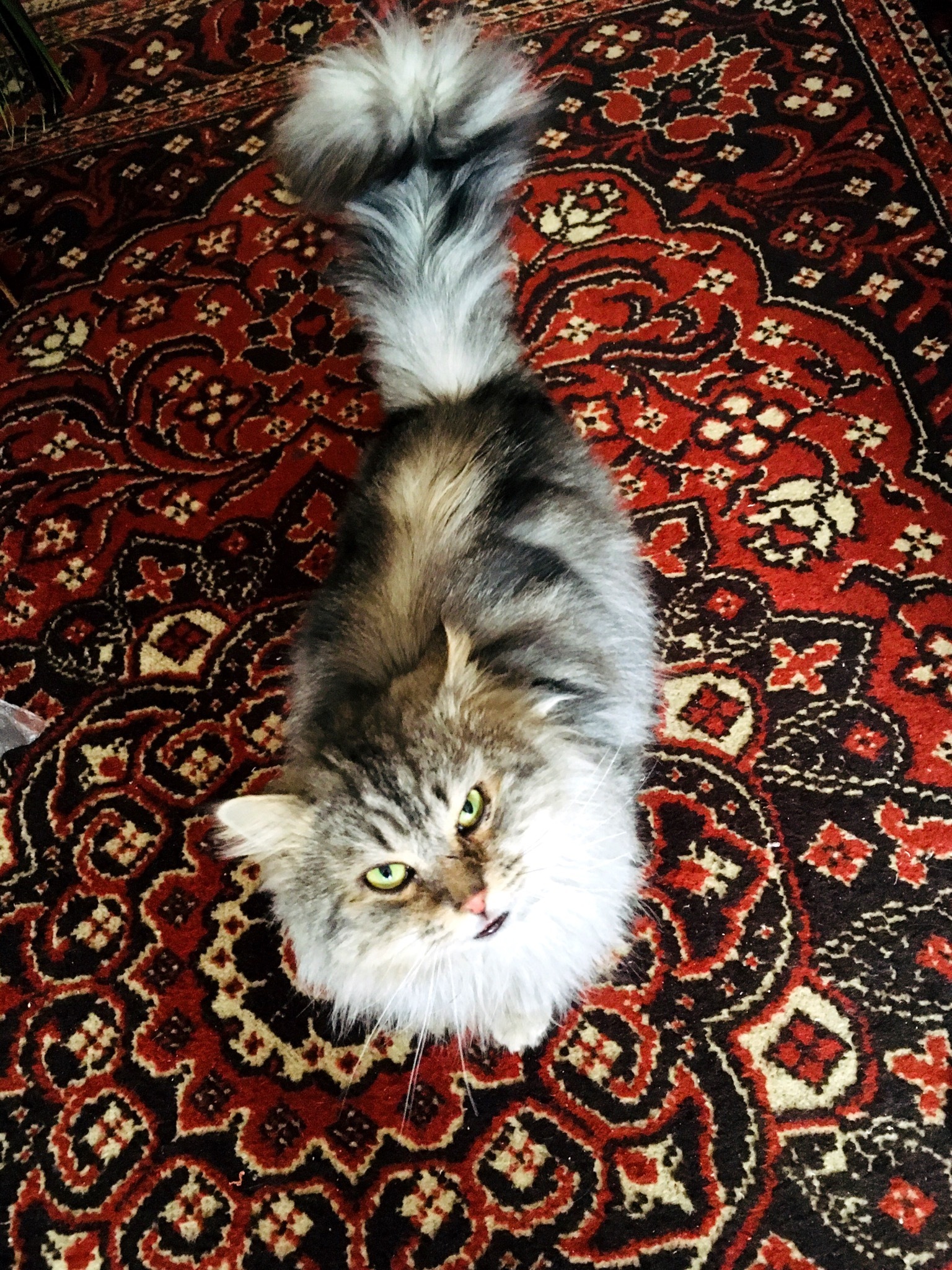 Окрас сірий з білим і чорним ,пухнаста , велика , з зеленими очима , приблизно 3- 5 років , з домашніми звичками , лагідна , порода мейн - кун ( напевно ), на ногах штанці , .