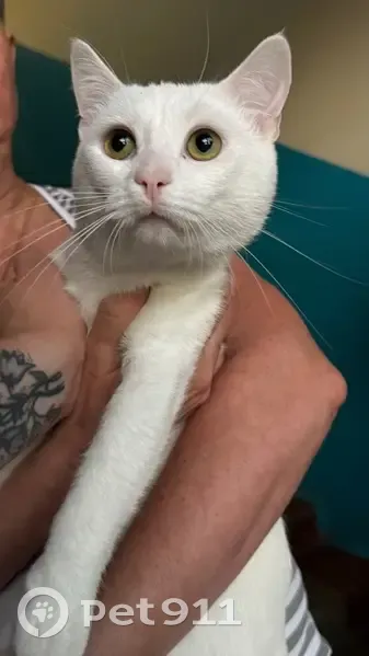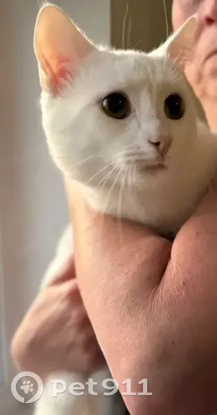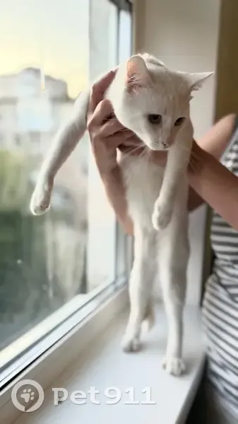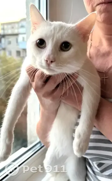 Вік: приблизно 1–3 роки. Чисто білого кольору, короткошерстний, з гарними м’язами та доглянутим виглядом. Шерсть м’яка, очі яскраво-жовто-зелені, вушка чисті. Некастрований.